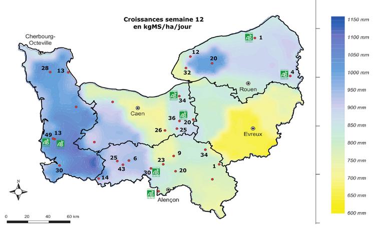 Les situations de stocks d'herbe sur pied sont très différentes d'un site à l'autre. La moyenne des hauteurs d'herbe sur le circuit de pâturage des sites Normands est de 7,4 cm. Elle va de 5 cm pour le site avec le stock le plus faible à 10,7 cm pour le stock le plus élevé.