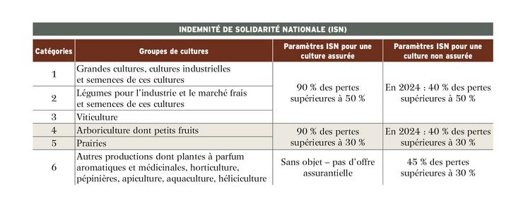 Pour les cultures non-assurées, et dans l'hypothèse où le taux de perte de la culture dépasse un certain seuil (30 ou 50 % selon la culture - lire tableau), il est possible de bénéficier de l'indemnité de solidarité nationale (ISN).