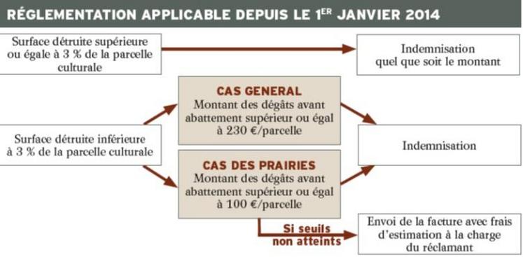 Quelques rappels afin d'éviter les écueils d'une déclaration non recevable. Toute indemnisation est exclue pour des dégâts forestiers et des pertes indirectes ; de même, nul ne peut prétendre à une indemnisation si les animaux qui ont commis les dégâts viennent de son propre fonds. Le constat (surface-rendement-...) de l'estimateur doit obligatoirement avoir lieu avant remise en état ou récolte. Enfin, pour prétendre à une indemnisation, les dégâts devront dépasser un seuil de surface ou montant, retenus depuis 2014.