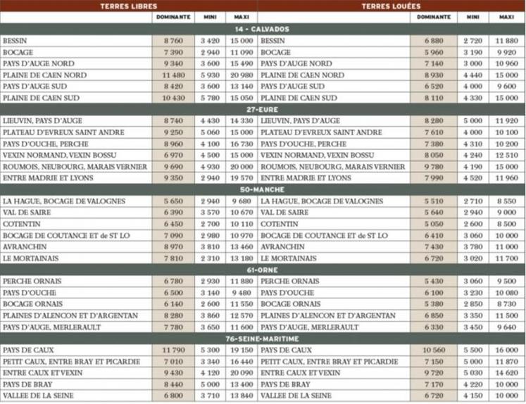 La région Normandie : vous trouverez dans le tableau ci-dessous, les barèmes indicatifs de la valeur vénale moyenne des terres agricoles pour l'année 2020 dans les cinq départements normands.